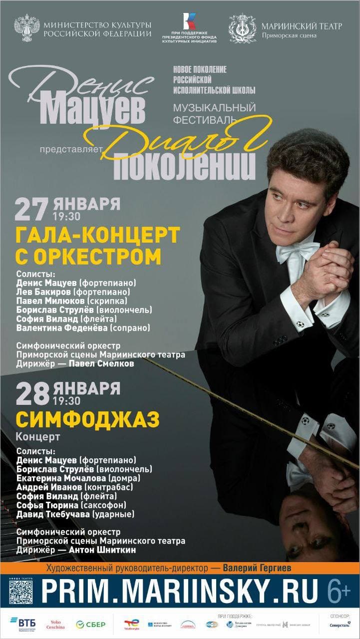 Украшением программы фестиваля станет вечер «Симфоджаз» (28 января) на Приморской сцене Мариинского театра с участием Дениса Мацуева и его друзей, джазменов, на котором прозвучит традиционный джаз и импровизации на классические темы. Концерт пройдет в сопровождении Симфонического оркестра Приморской сцены Мариинского театра под управлением Антона Шниткина.