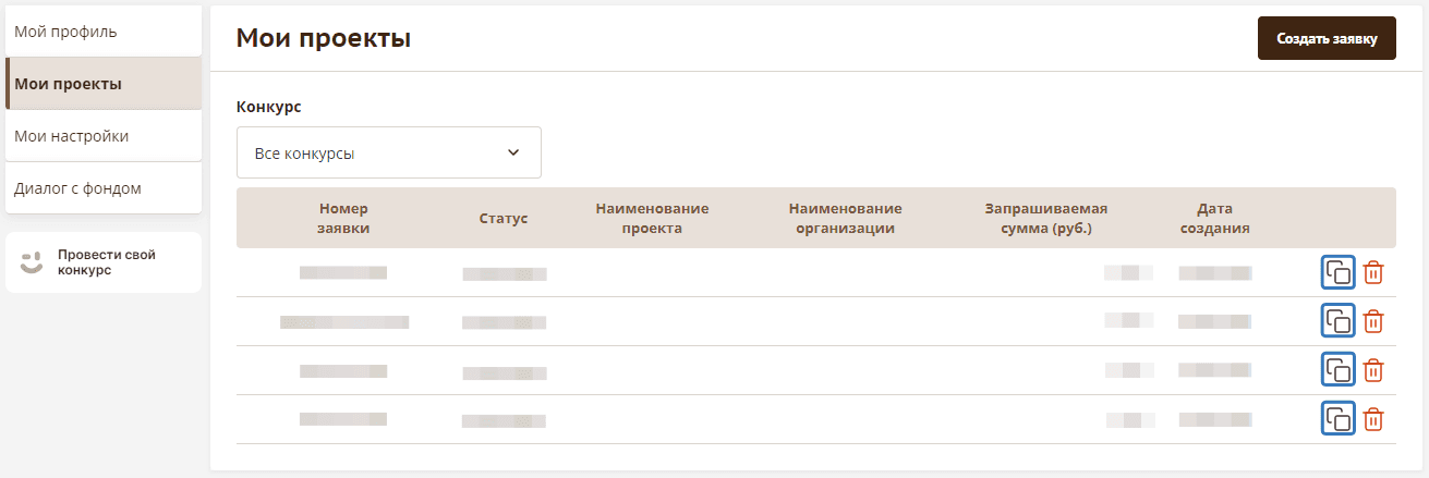 Для того чтобы доработать заявку, которая не получила поддержку, и повторно подать ее на ближайший конкурс, необходимо создать новую заявку на основе исходной. Сделать это можно с помощью всего одной кнопки в личном кабинете: