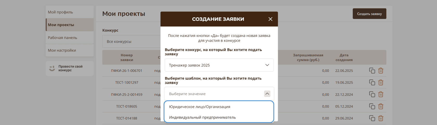 Предусмотрена возможность создания двух типов заявок: конкурсных и тестовых.