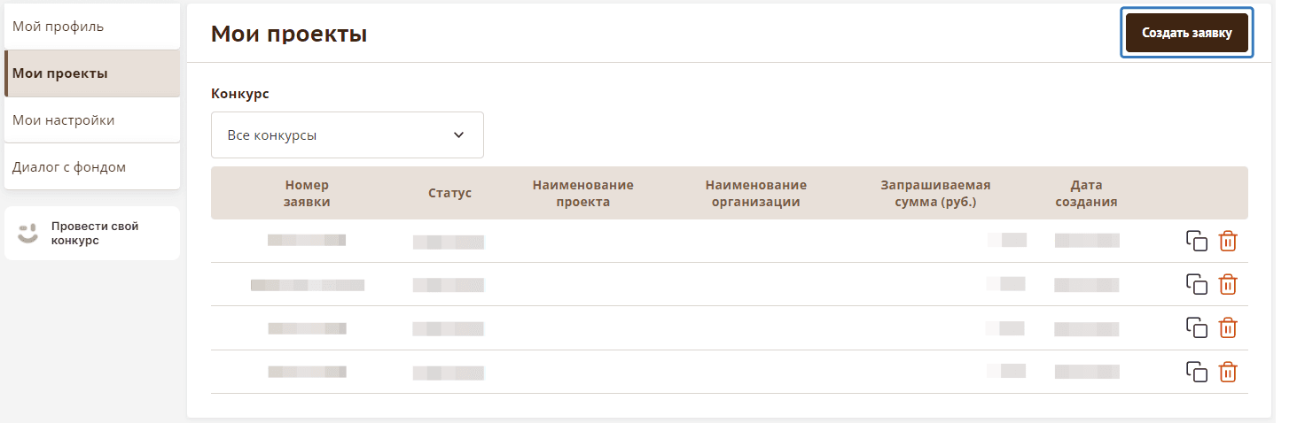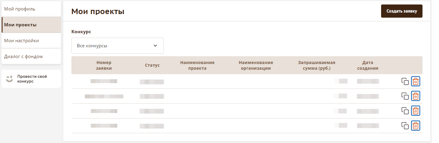 Для того чтобы удалить заявку, в разделе «Мои проекты» воспользуйтесь иконкой корзины в правой части соответствующей строки.