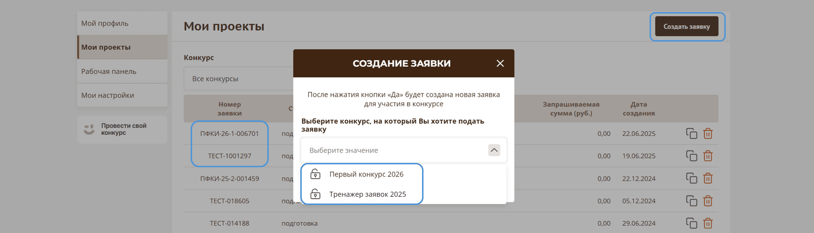и нажмите кнопку «Да». После чего, в разделе «Мои проекты», на основе указанных параметров, автоматически будет создана новая заявка.