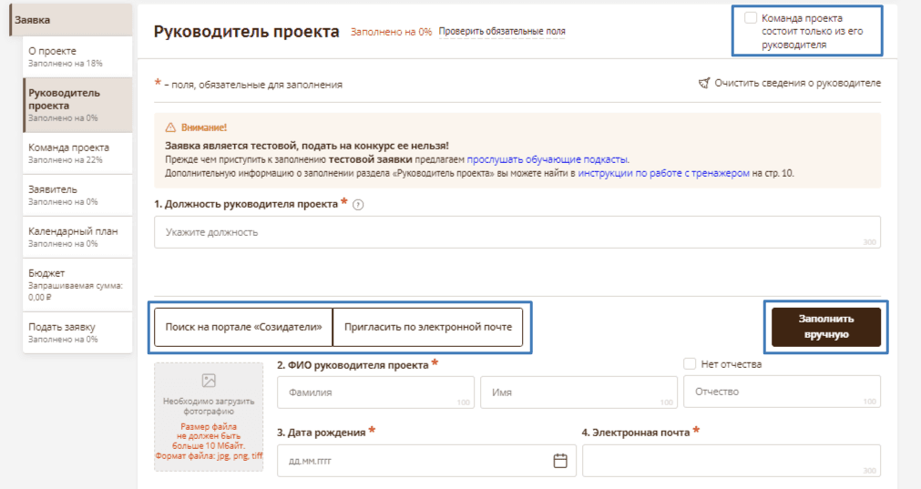 Как заполнить раздел «Руководитель проекта»