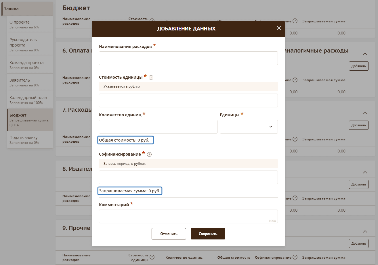Общую стоимость и запрашиваемую сумму по каждой статье информационная система рассчитает автоматически — в столбцах «Общая стоимость» и «Запрашиваемая сумма».