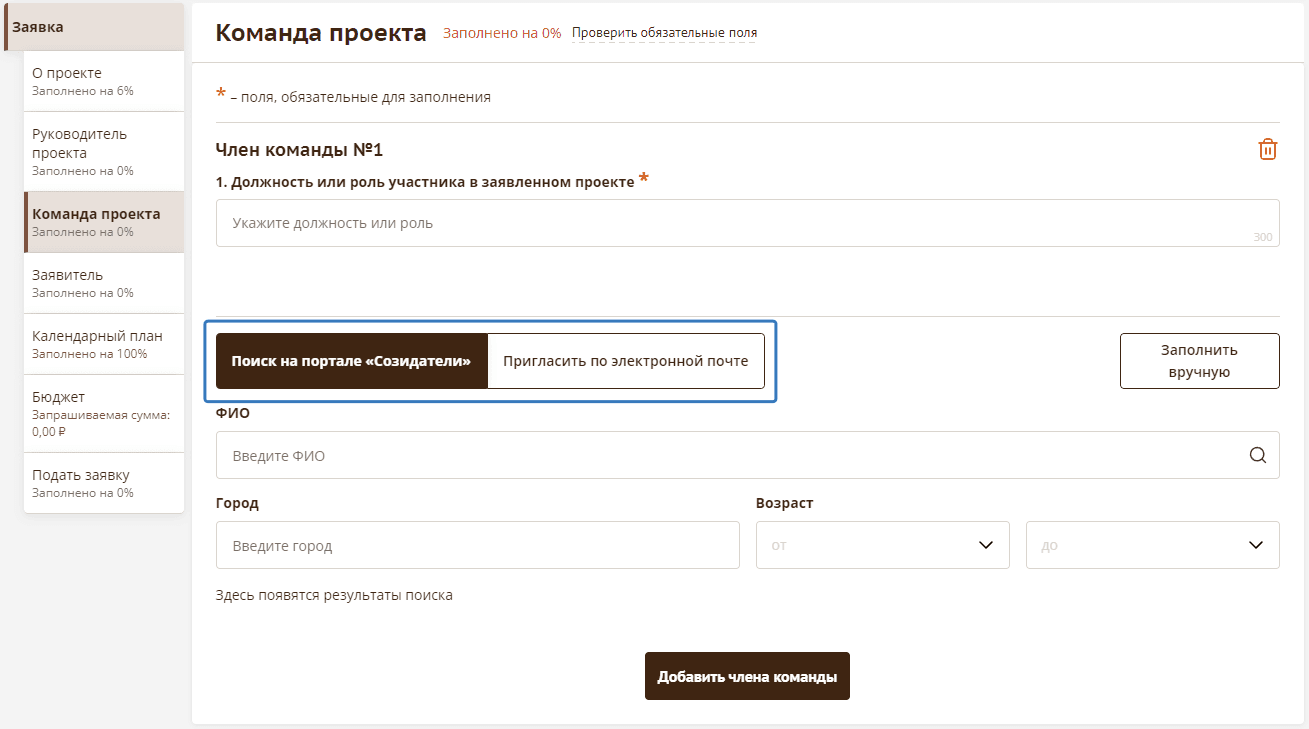Если руководитель или член команды регулярно участвует в грантовых проектах, выполняя разные функции, то рекомендуется проверить актуальность информации о специалисте на портале «Созидатели».