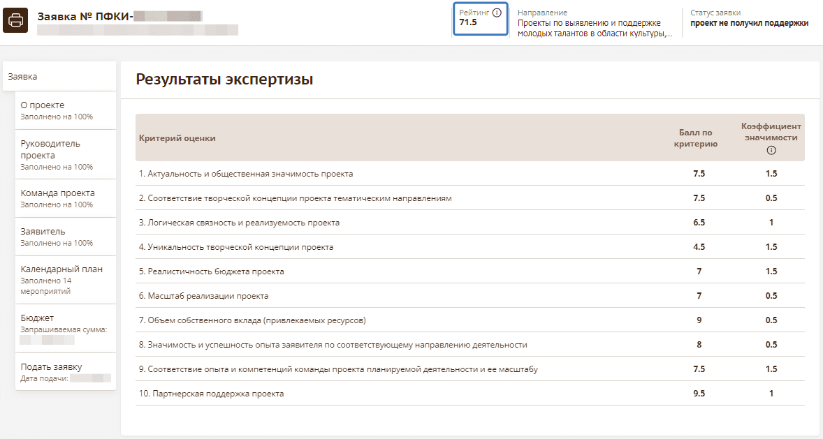 не только с итоговым рейтингом заявки, но и с оценками по каждому из 10 критериев. Для этого откройте вашу заявку в личном кабинете и нажмите на полученный рейтинг. Он находится справа от номера заявки.