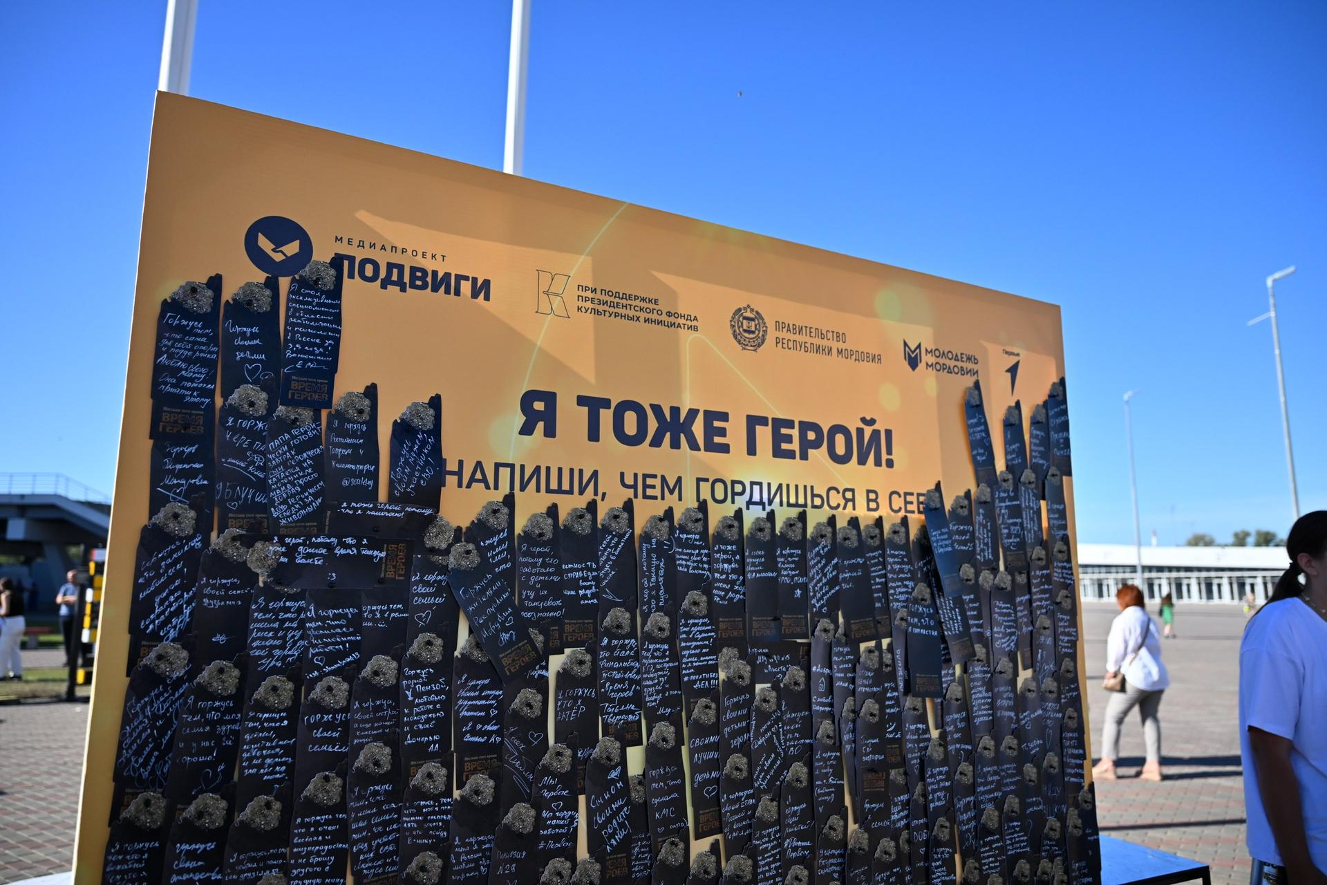 Фестиваль «Время героев» и церемония награждения прошли при поддержке Президентского фонда культурных инициатив. На территории стадиона «Мордовия Арена» работало более 100 разнообразных тематических площадок и активностей. Среди них: площадка «средневековая деревня» с реконструкторами, творческие мастерские, спортивные зоны, площадка с питомцами из приюта. «Почта России» организовала для фестиваля специальную точку, где можно было бесплатно отправить открытку в любой регион. Для площадки «Подвиги» были изготовлены открытки с изображением российских героев-современников.