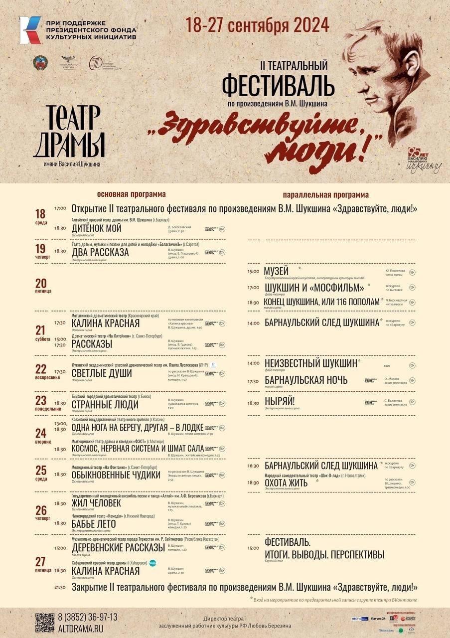В рамках параллельной программы можно будет познакомиться с пьесами современных драматургов, осмысляющих судьбу Василия Шукшина. Фестивальный эксклюзив – две экскурсии: «Барнаульский след Шукшина» историка и краеведа Данила Дегтярева и «Шукшин и «Мосфильм», подготовленная сотрудниками Музея-заповедника Шукшина в Сростках. Завершит программу круглый стол «Фестиваль: итоги, выводы, перспективы» с участием организаторов и партнеров фестиваля, алтайских литературоведов и российских театральных критиков.