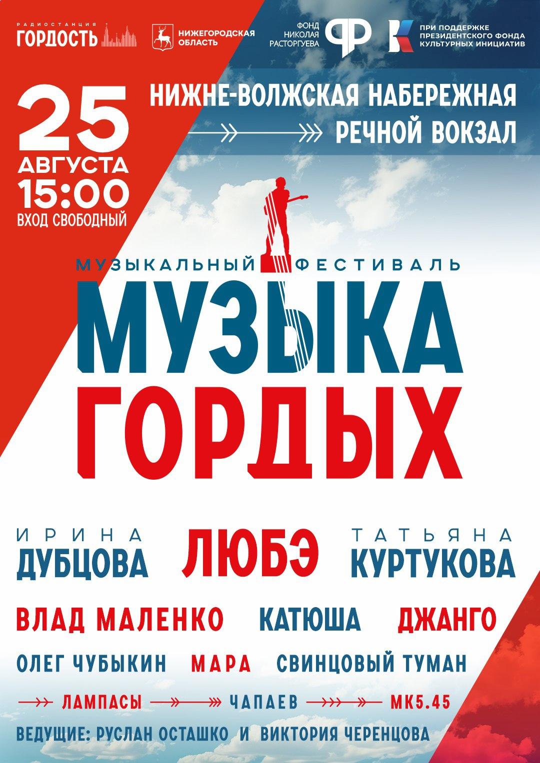 Организаторы объявили состав участников фестиваля патриотической песни «МУЗЫКА ГОРДЫХ». Он пройдет в последнее воскресенье лета в Нижнем Новгороде. Музыкальный праздник организуют фонд Николая Расторгуева совместно с федеральным радио «Гордость» при поддержке Президентского фонда культурных инициатив и Правительства Нижегородской области.