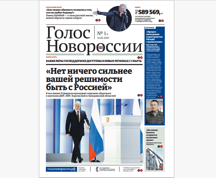 В начале 2023 года на освобожденных территориях в сжатые сроки было создано новое средство массовой информации – газета «Голос Новороссии» - которое быстро заняло свою нишу и нашло заинтересованных читателей. Тираж в 50.000 разлетелся, как «горячие пирожки». Редакция расположилась на площадке издательского дома АО «Комсомольская правда» в Белгороде. Главная тема газеты: восстановление исторической справедливости и объединение всех частей Слобожанщины в составе РФ, которая была в ней на полтора века дольше, чем Украина.
