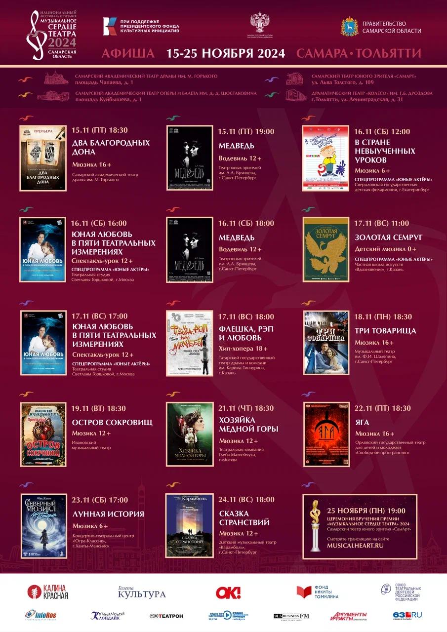 С 15 по 24 ноября в Самаре и Тольятти пройдут показы российских музыкальных спектаклей из Москвы, Санкт-Петербурга, Самары, Казани, Иваново, Орла и Ханты-Мансийска, номинированных на соискание премии «Музыкальное сердце театра» в 2024 году. Мероприятие реализуется при поддержке Президентского фонда культурных инициатив, Министерства культуры РФ, Правительства Самарской области и Союза театральных деятелей РФ. Все постановки были отобраны с учетом жанрового многообразия, а сами спектакли ориентированы на широкую зрительскую аудиторию. Большинство из них будут сопровождаться тифлокомментированием. Зрители могут ознакомиться с информацией и приобрести билеты на показы спектаклей-номинантов на сайте фестиваля.
