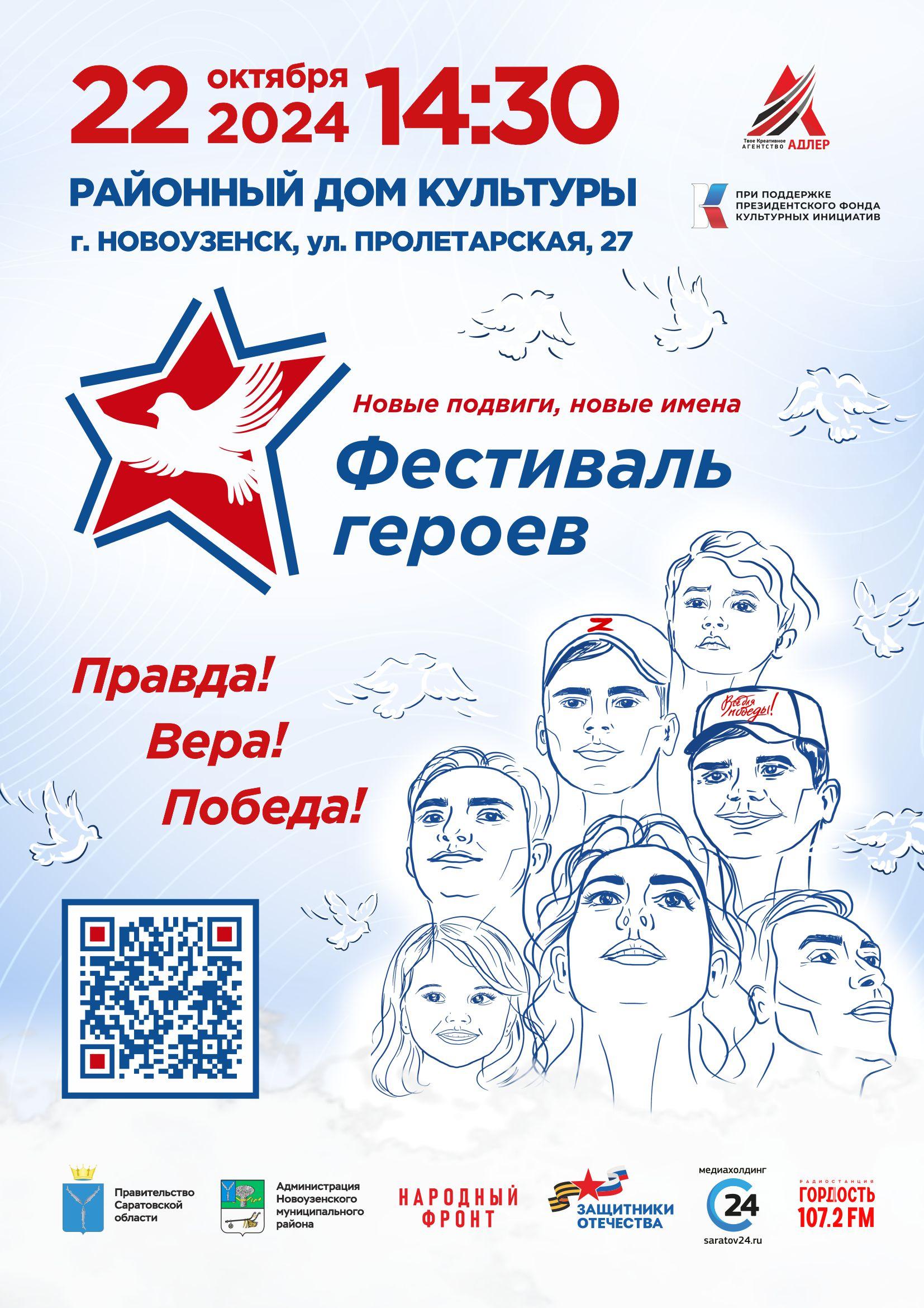 Мероприятие проекта «Фестиваль героев. Новые подвиги, новые имена» состоится 22 октября в 14:30 в Районный дом культуры (Новоузенск, ул. Пролетарская, 27). Вход свободный. Перед основной программой желающие смогут побывать на мультимедийной выставке «Портреты Саратовских героев СВО» и увидеть Новоузенских героев.