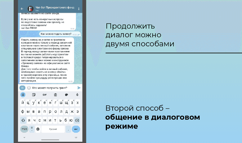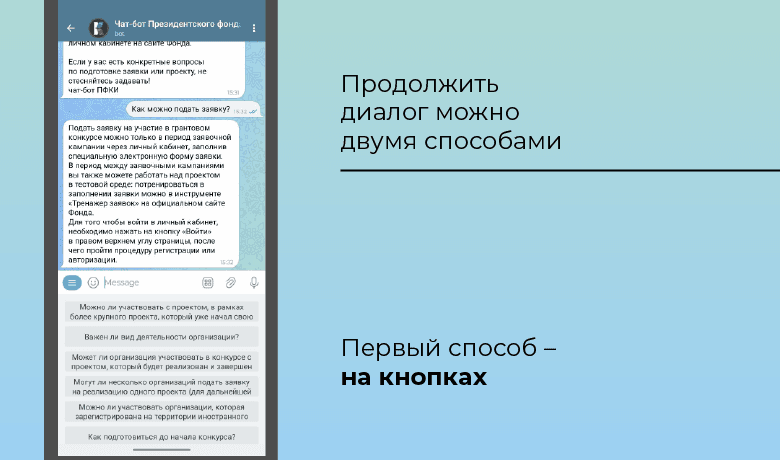 При ответах чат-бот предлагает кнопки для продолжения диалога. Если кнопки не появляются сами, нажмите на квадрат с четырьмя точками рядом с письменной строкой. Продолжить диалог можно двумя способами. Первый — на кнопках. Второй вариант — в диалоговом режиме.Разбор сложных ситуаций или вопросов, на которые бот не смог ответить, по-прежнему можно адресовать специалистам контактного центра ПФКИ по номеру +7 (495) 150-50-15.