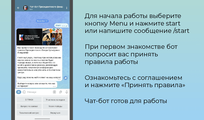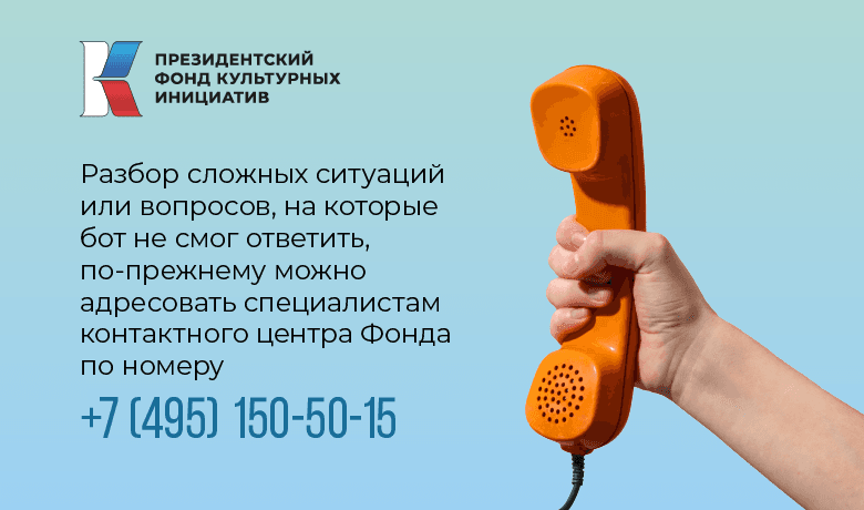 К старту нового грантового конкурса Президентский фонд культурных инициатив запустил чат-бот в Telegram. Идея создать такого виртуального помощника появилась несколько месяцев назад и тщательно продумывалась командой Фонда. Теперь потенциальные заявители смогут оперативно в любое время суток найти ответы на вопросы о заполнении заявок. Протестировать ИИ-помощника можно уже сейчас, переходите в @PFKI_bot. Рекомендуем пользоваться чат-ботом через приложение Telegram для смартфона и компьютера.
