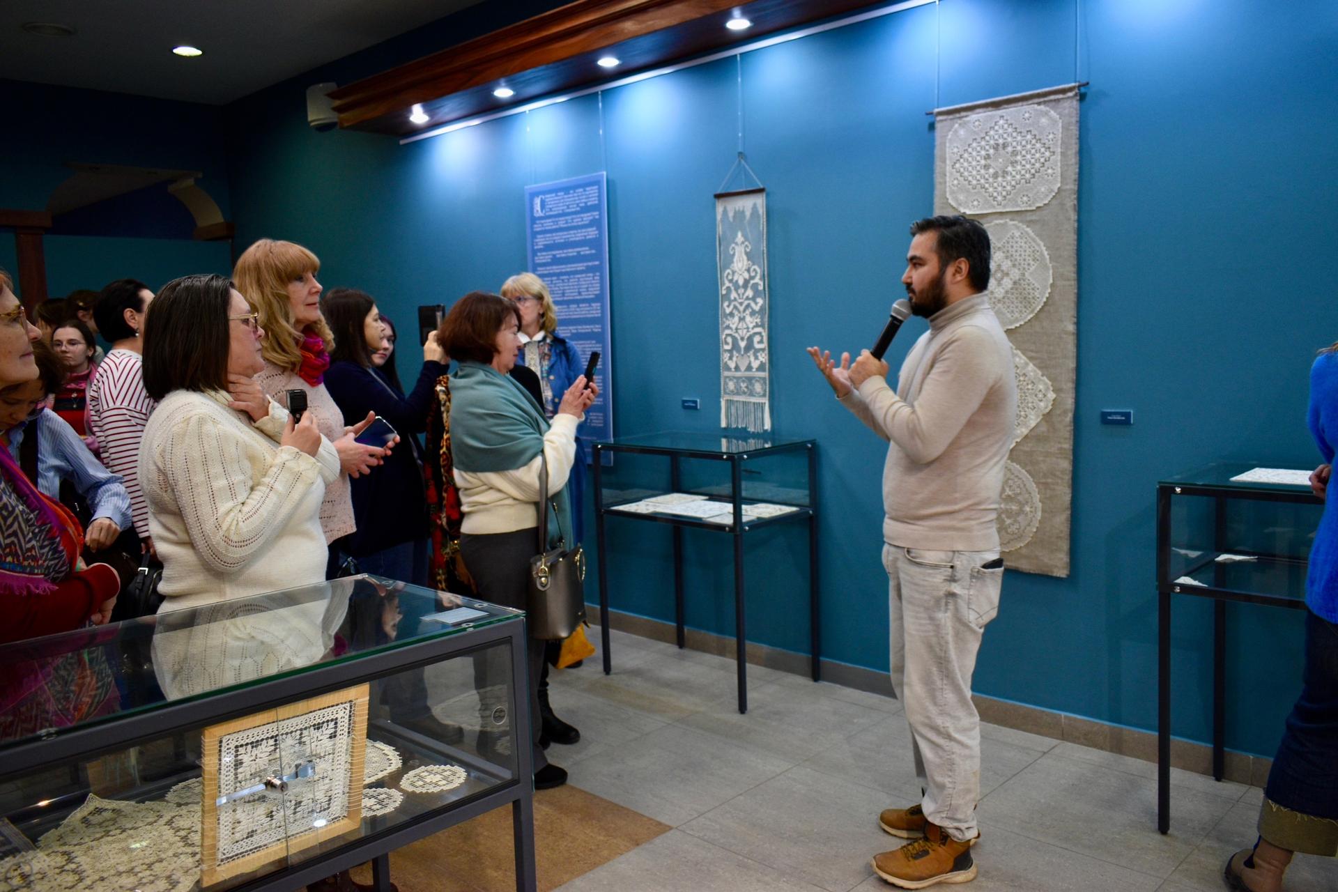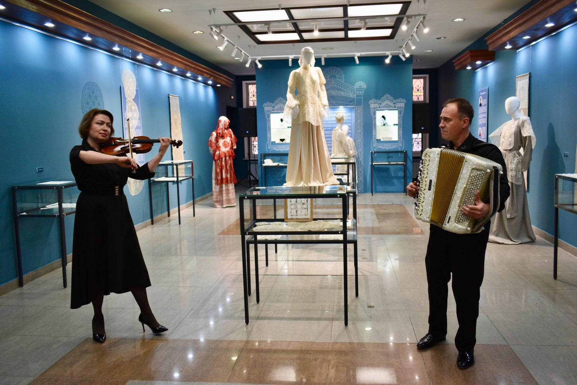 После торжественной части посетители смогли глубже погрузиться в историю тончайших узоров на кураторской экскурсии и поучаствовали в мастер-классе от мастерицы Ольги Якуниной. Участники не только узнали секреты этого ремесла, но и сделали свои первые стежки на сетке.