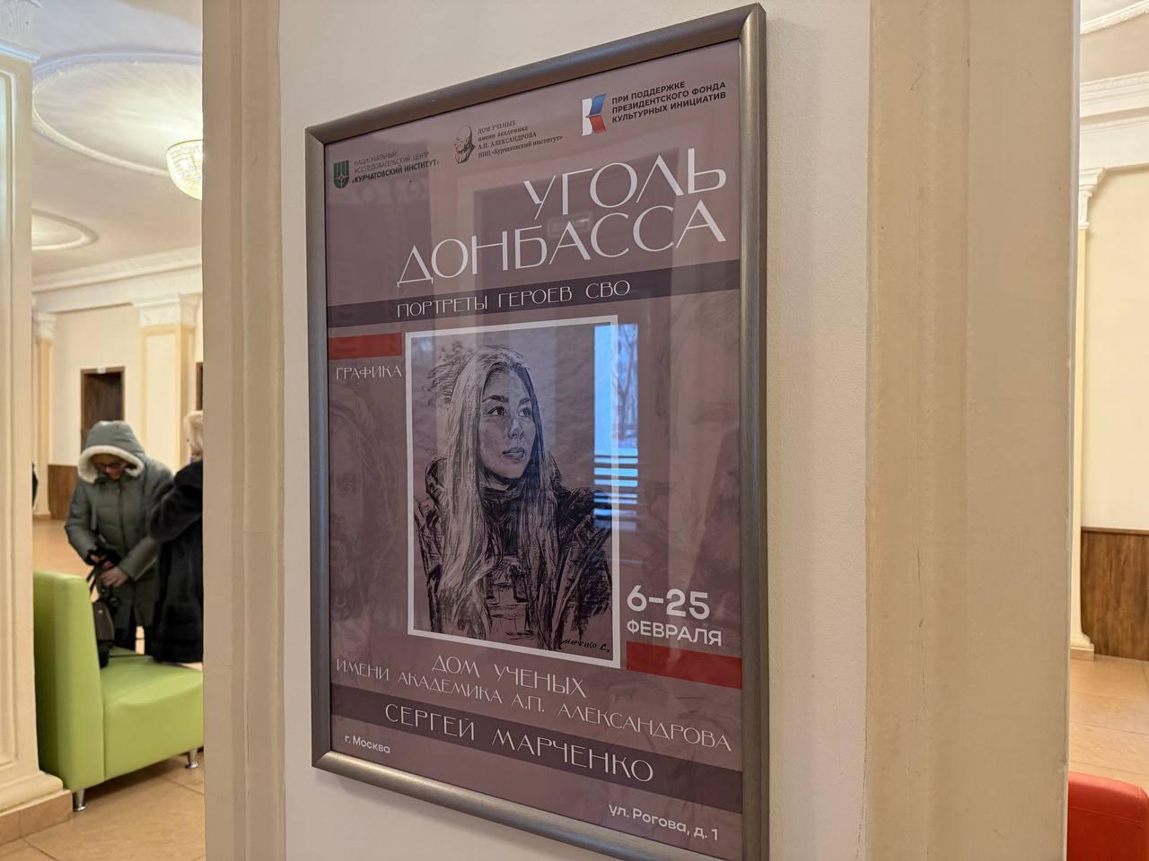 В Доме ученых им. Александрова в Москве до 25 февраля экспонируется выставка «Уголь Донбасса». Это графические портреты участников СВО – добровольцев, военнослужащих, волонтёров, медиков. Рядом с работами прикреплён QR-код со ссылкой на видеоролик с авторской экскурсией по портрету. Автор – Сергей Марченко. Художник вдохновился авторским проектом военного корреспондента Марьяны Наумовой «Мы Живы» на 1-м канале, где герои ёмко и информативно рассказывают о своей судьбе.