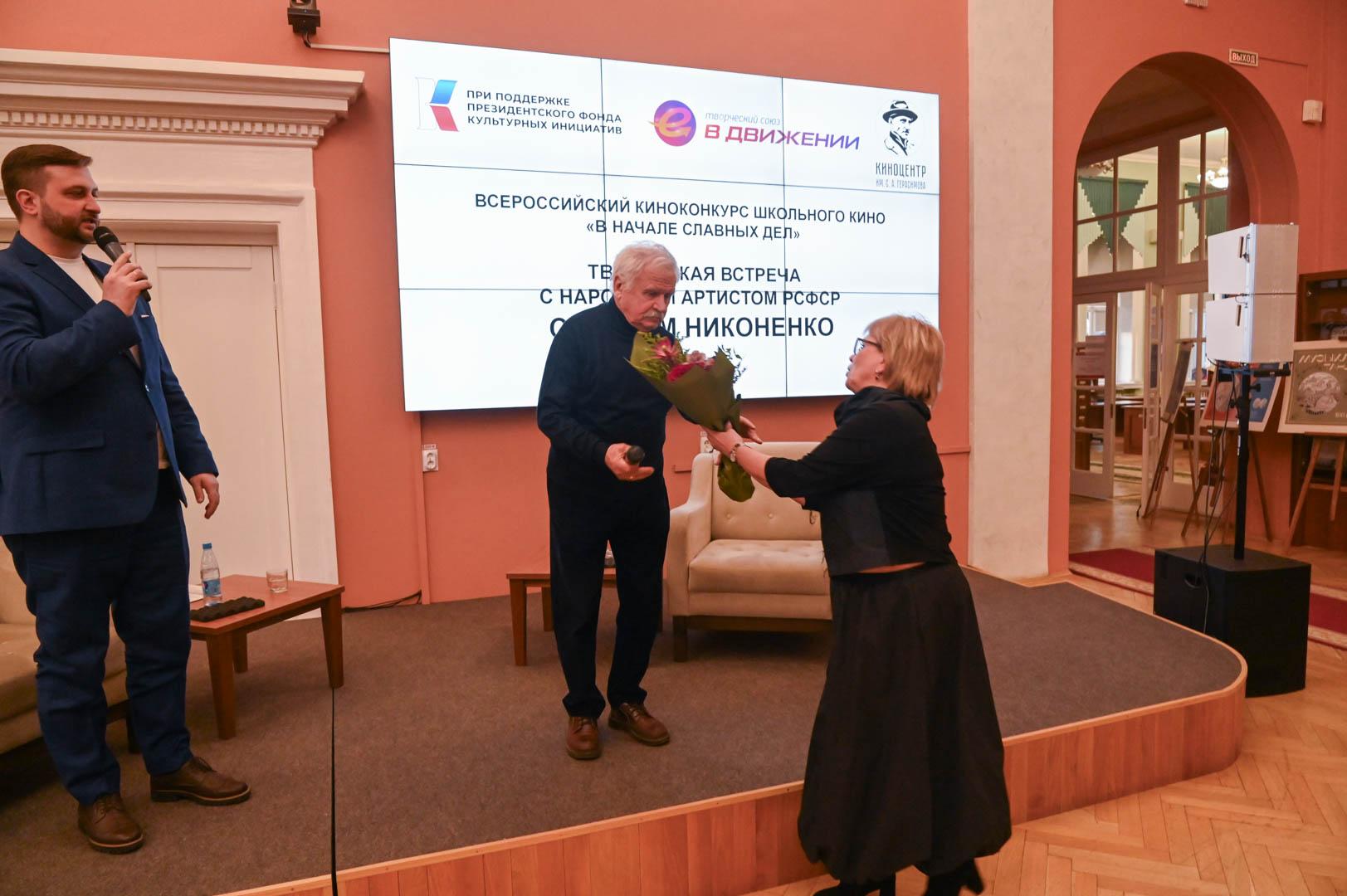 В рамках всероссийского Герасимовского киноконкурса «В начале славных дел» в креативном пространстве Челябинской областной универсальной научной библиотеки прошла творческая встреча с народным артистом РСФСР, учеником С.А. Герасимова Сергеем Петровичем Никоненко. Участники встречи – полторы сотни человек: школьники, занимающиеся кинотворчеством, мультипликацией и тележурналистикой, педагоги допобразования, студенты Южноуральского государственного колледжа искусств, отделения актерского и театрального искусства. Была организована онлайн трансляция. Сергей Петрович рассказал ребятам о творческом пути, учителе, Пушкине, Есенине, читал стихи, говорил о друзьях, с которыми вместе работал на съемках, любимых книгах и авторах. Старшеклассники спрашивали о том, что важно в профессии актера, интересовались мнением Сергея Петровича о состоянии современного кино и театра, о современных режиссерах.