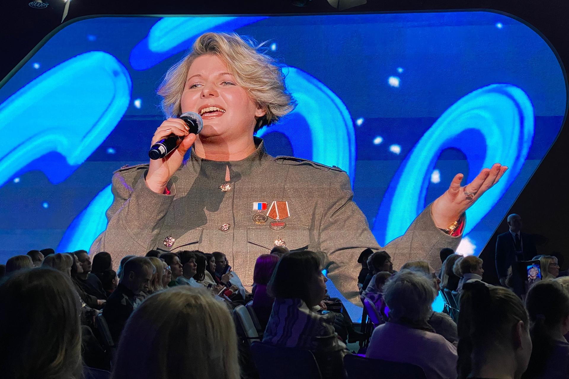 Первыми выступили участницы женской боевой музыкальной группы «Катюша». Трио вокалисток, пишущих и исполняющих собственные песни, с мая 2023 года совершило уже 20 командировок в зону проведения СВО. Девушки не только выступали перед бойцами с лирическими и духоподъемными песнями, но и доставляли им гуманитарную помощь. Группа «Катюша» на гала-концерте покажет признанные авторские хиты, а также военные песни, любимые многими поколениями россиян.