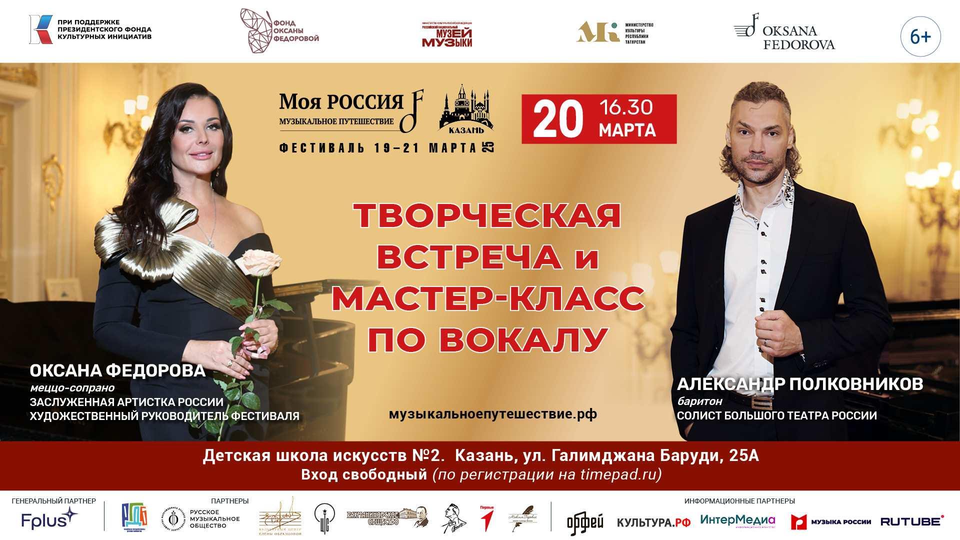 Второй день Фестиваля посвящен юным музыкантам – 20 марта в концертном зале Детской школы искусств № 2 пройдет творческая встреча и мастер-класс по вокалу с участием Оксаны Федоровой и амбассадора Фестиваля – солиста Большого театра России Александра Полковникова. После мастер-класса состоится концерт «Юные таланты Татарстана», в котором примут участие победители и финалисты Международного конкурса юных музыкантов «Моя Россия: музыкальное путешествие» из Казани, Набережных Челнов, Санкт-Петербурга, лауреаты и стипендиаты музыкальных конкурсов из Татарстана. В концертной программе прозвучат произведения Римского-Корсакова, Рахманинова, Прокофьева, а также русские и татарские фольклорные композиции.