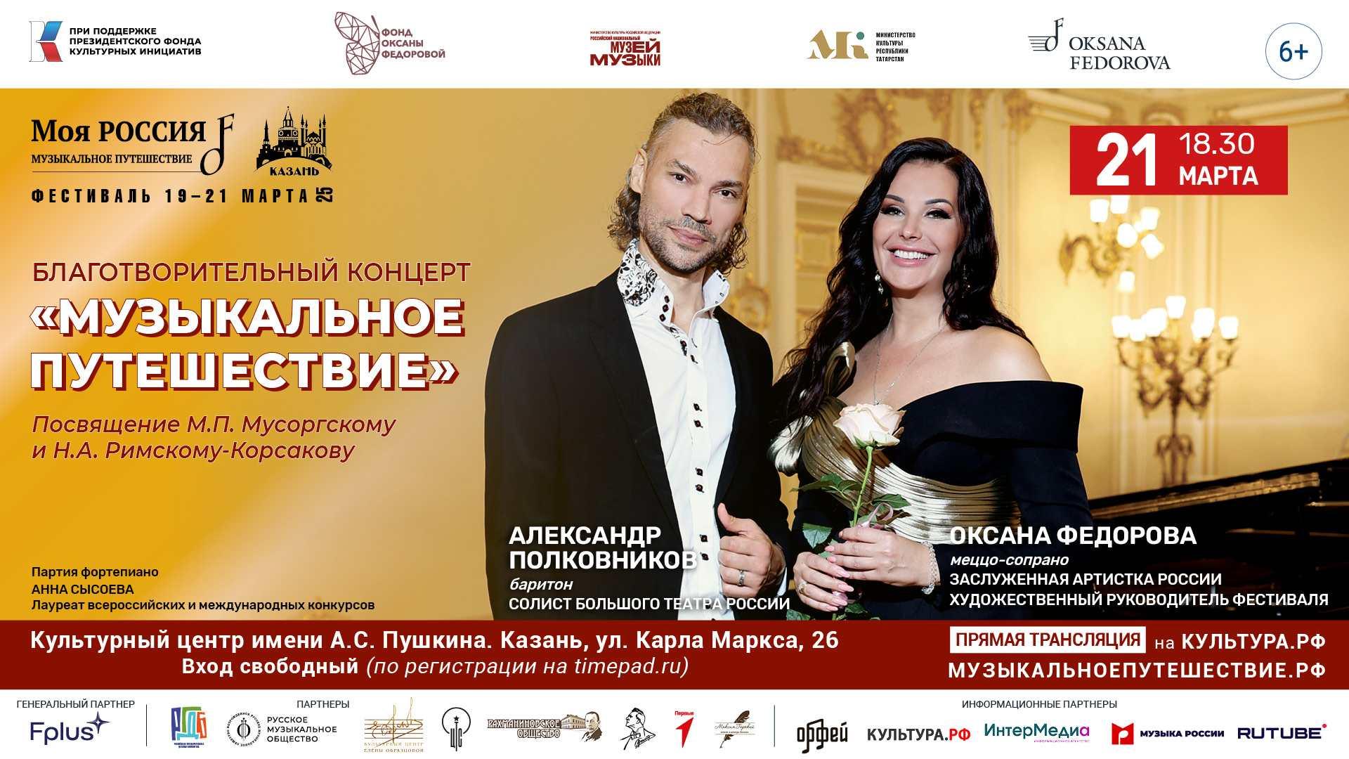 Фестиваль в столице Татарстана приурочен к Дням рождения двух великих классиков – Н.А. Римского-Корсакова (18.03.1844 г.) и М.П. Мусоргского (21.03.1839 г.). Программа включает кинопоказ, творческие встречи и мастер-классы, а также концерты с участием юных талантов республики и артистов большой сцены. Открытие состоится 19 марта в формате кинопоказа фильма «Музыкальное путешествие по Москве» в кинотеатре «Мир». Фильм представит Оксана Федорова, выступившая режиссером и ведущей телепроекта «Моя Россия: музыкальное путешествие», в рамках которого с 2021 по 2023 гг. выпущены 20 телефильмов о музыкальной истории городов России.