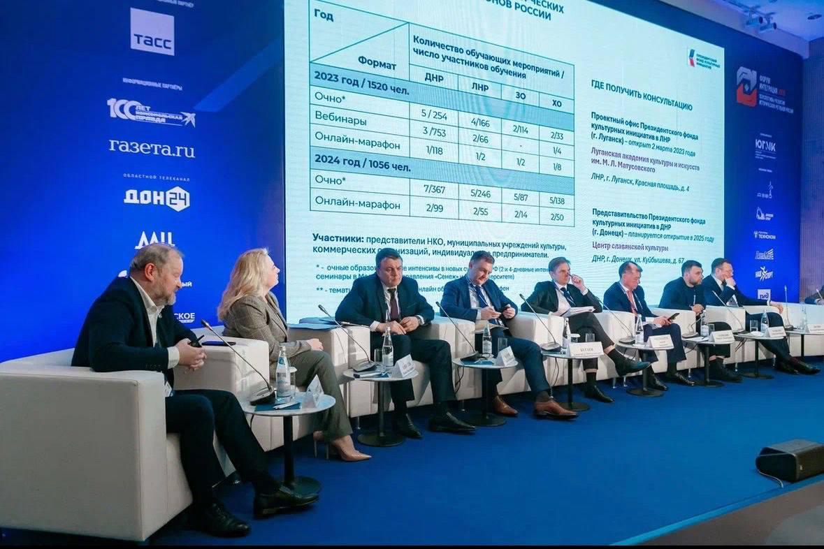 Первый заместитель генерального директора Президентского фонда культурных инициатив Игорь Соболев выступил на форуме с докладом о поддержке творческих инициатив в Донбассе и Новороссии, а также о благотворительных программах фонда для учреждений культуры и спорта. «С 2023 года, когда творческие команды получили возможность самостоятельно подавать заявки на гранты, мы наблюдаем высокий интерес: от новых субъектов поступило множество инициатив, из которых 67 проектов на сумму 209 миллионов рублей уже реализуются. Всего в регионах России при участии коллективов из новых территорий реализуются 846 проектов на общую сумму 6,5 миллиарда рублей. Многие из них посвящены культурной интеграции и формированию общего историко-культурного пространства. Другим важным направлением стала программа пожертвований, реализуемая за счёт средств партнёров фонда — коммерческих организаций. За два года было выделено свыше 4,6 миллиарда рублей на укрепление материально-технической базы учреждений культуры и спорта. Это позволяет создавать достойные условия для проведения мероприятий и эффективной работы с детьми и взрослыми», - сказал Игорь Соболев.