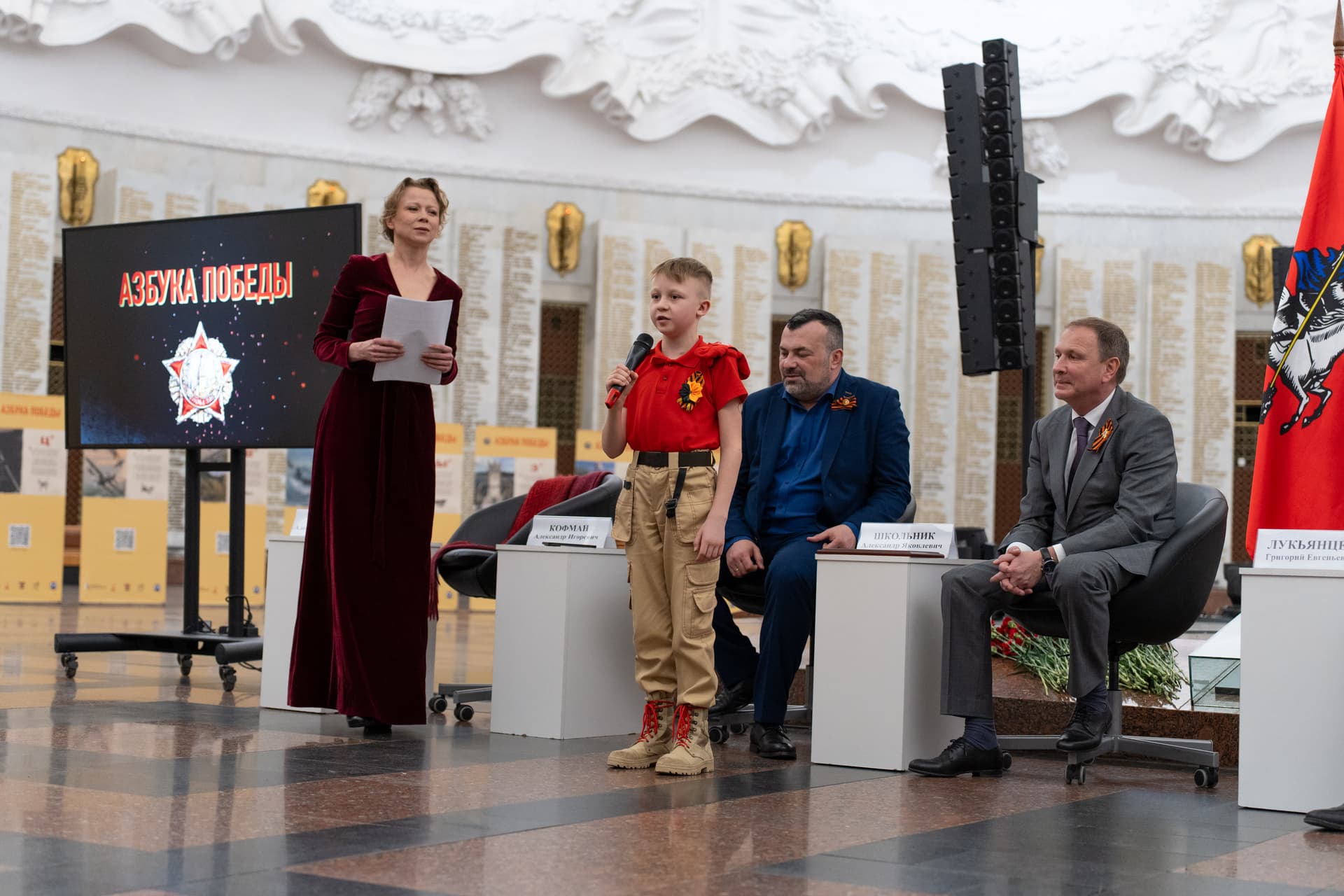 В торжественной презентации «Азбуки Победы» приняли участие генеральный директор Музея Победы, заместитель секретаря Общественной палаты РФ Александр Школьник, директор Департамента многостороннего сотрудничества по правам человека МИД России Григорий Лукьянцев, заместитель главного редактора телеканала RT Владимир Белко, руководитель АНО «Комитет семей воинов Отечества» Юлия Белехова, член Общественной палаты РФ Владимир Рогов, журналист Петр Лидов, музыкальный продюсер проекта Евгений Кобылянский, адвокат и общественный деятель Сталина Гуревич, ректор Института театрального искусства им. И.Д.Кобзона Дмитрий Томилин, журналист-международник Георгий Зотов и другие лидеры общественного мнения. В роли ведущей презентации выступила актриса БДТ Александра Куликова, также озвучившая ряд стихотворений.