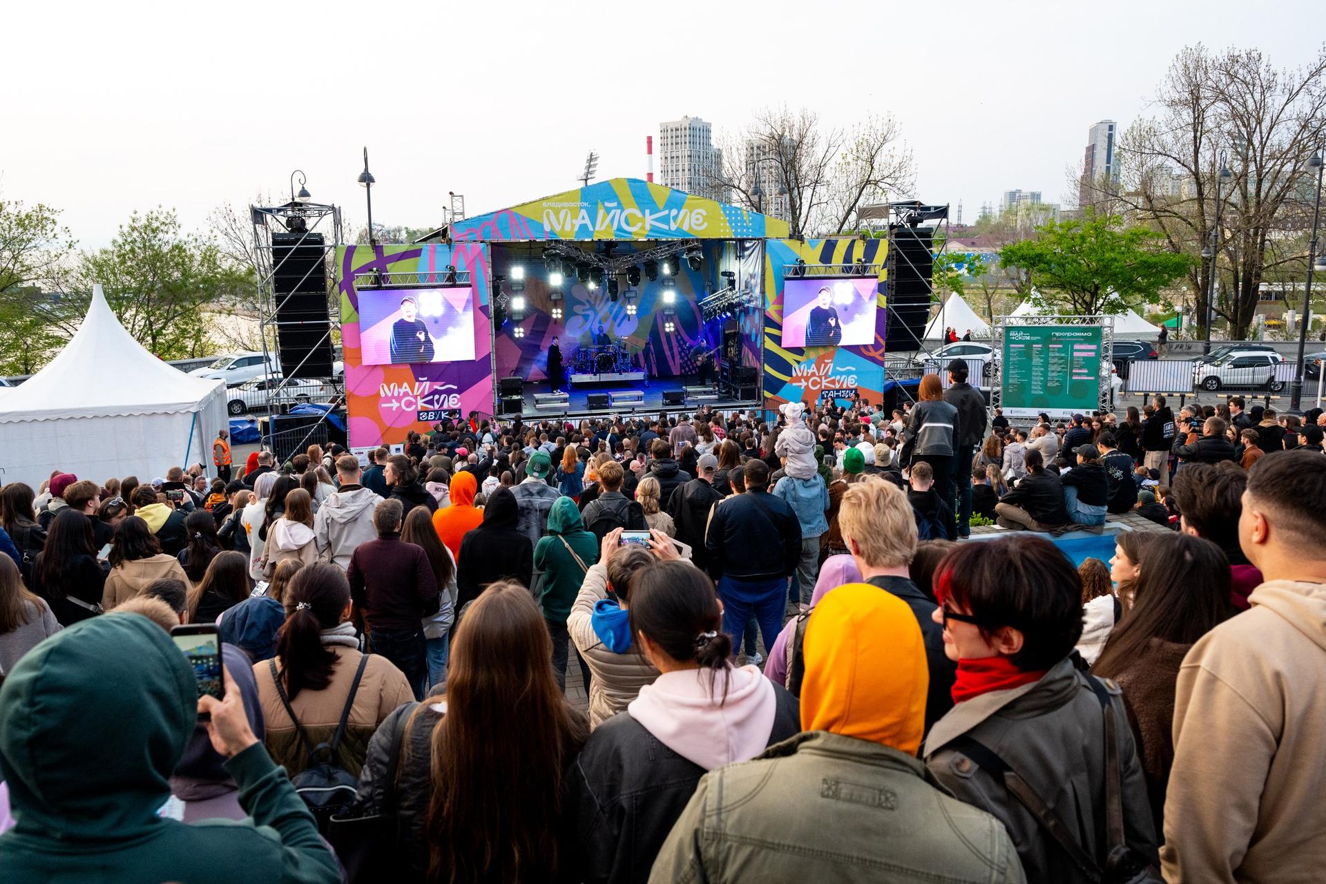 На два дня бухта Спортивная погрузилась в атмосферу музыки, искусства, гастрономии и уличной моды — здесь прошёл Второй международный кросс-культурный фестиваль «Владивосток.МАЙСКИЕ». Несмотря на переменчивую погоду — шквалистый ветер и дождь сменялись ярким солнцем — площадка Общественно-культурного центра «Океан» была полна людей. Зрители пришли поддержать любимых исполнителей, поучаствовать в конкурсах на скоростное поедание мидий, оценить модные импровизации приморских дизайнеров и выбрать победителей танцевальных баттлов.