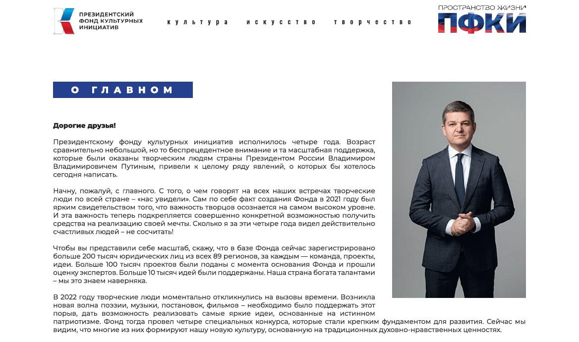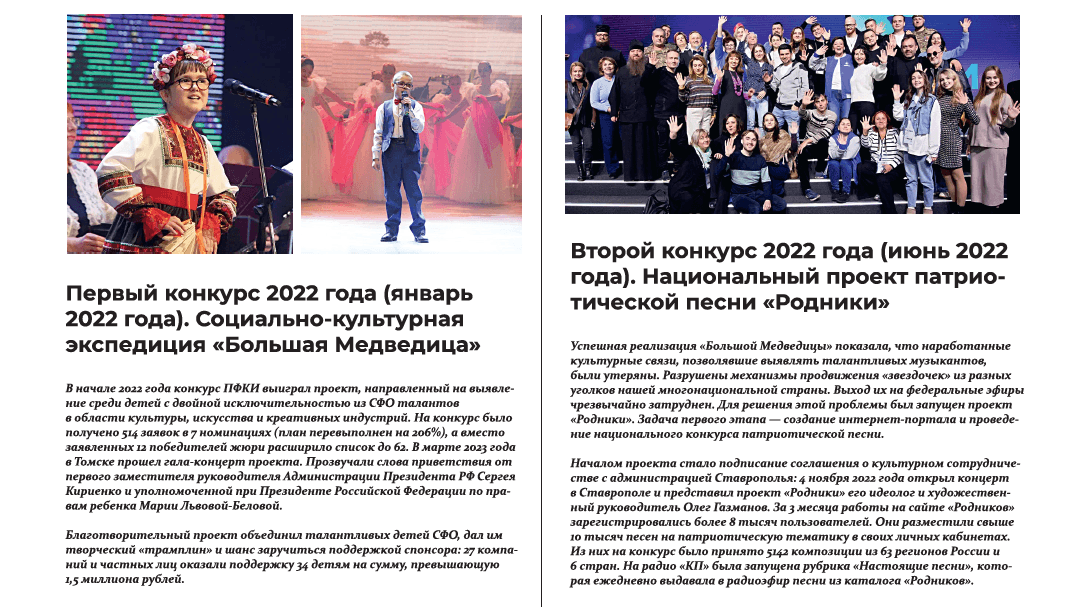 «Президентскому фонду культурных инициатив исполнилось четыре года. Возраст сравнительно небольшой, но то беспрецедентное внимание и та масштабная поддержка, которые оказаны творческим людям страны Президентом России, привели к целому ряду явлений. Сам по себе факт создания Фонда в 2021 году был ярким свидетельством того, что важность творцов осознается на самом высоком уровне. И эта важность подкрепляется совершенно конкретной возможностью получить средства на реализацию своей мечты. В базе Фонда зарегистрировано больше 200 тысяч юридических лиц из всех 89 регионов, за каждым — команда, проекты, идеи. Больше 100 тысяч проектов были поданы с момента основания Фонда и прошли оценку экспертов. Больше 10 тысяч идей были поддержаны. Наша страна богата талантами – мы это знаем наверняка. О них и для них создан наш новый журнал».