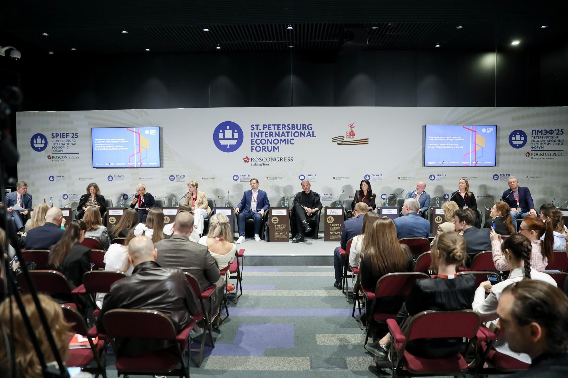 Сессия «Креативные индустрии и традиции: синергия бизнеса, культуры и ремесел», организованная Президентским фондом культурных инициатив, прошла сегодня на площадке ПМЭФ-25. Главной темой обсуждения стало то, как креативные индустрии превращаются в важный драйвер экономического развития, объединяя традиционные ремесла, современные технологии и предпринимательский подход. Региональные проекты, основанные на национальных традициях, не только сохраняют культурное наследие, но и формируют новые бизнес-модели, привлекая туристов, инвесторов и молодые таланты. Свои проекты представили те люди, которые смогли создать настоящие точки притяжения для местных жителей, туристов и меценатов в своих регионах. Не просто создать, а научиться зарабатывать на любимом деле, мыслить далеко за рамками своих проектов — масштабировать их каждый год, придумывать и запускать новые идеи. Кто-то сделал этого, заручившись на самом старте поддержкой Президентского фонда культурных инициатив. Модератором дискуссии выступил генеральный директор ПФКИ Роман Карманов. В начале беседы он напомнил о вчерашнем выступлении Президента РФ на пленарном заседании ПМЭФ-2025.