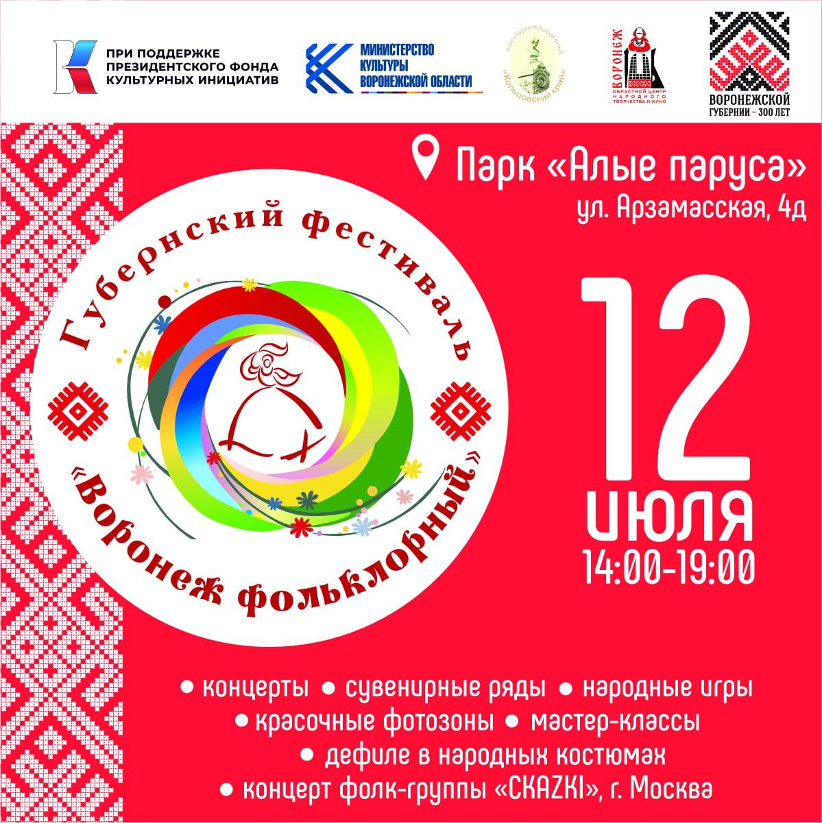 В этом году проект «Воронеж фольклорный» реализуется при поддержке Президентского фонда культурных инициатив. Организаторы мероприятия – благотворительный фонд «Кольцовский край» при поддержке Воронежского областного центра народного творчества и кино и министерства культуры Воронежской области. Фестиваль, приуроченный к Единому Дню фольклора, посвящен 300-летию образования Воронежской губернии.