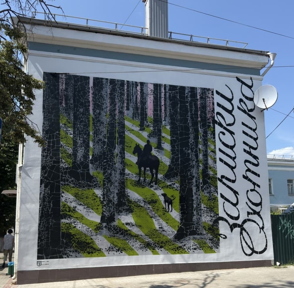 Первый мурал, посвящённый «Запискам охотника» Ивана Тургенева, появился на фасаде дома № 16/18 по улице Октябрьская. Его автор — петербургский художник FI2K (Филипп Дульмаченко). Композиция изображает лес, по земле которого тянутся 25 полос — по числу очерков в сборнике. Они словно приглашают зрителя пройти этот путь вместе с охотником Ермолаем и его собакой Валеткой. Для работы использована трафаретная техника, обеспечившая чёткость линий и высокую детализацию.