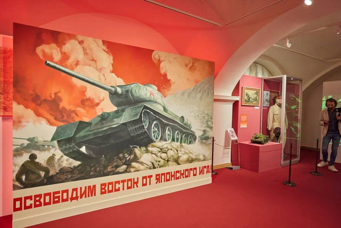 В экспозиции представлены уникальные предметы: личные вещи маршала Р. Я. Малиновского, генерала армии М. А. Пуркаева, карты боевых действий, ранее не публиковавшиеся фотографии фронтового корреспондента Анатолия Егорова, декоративный зонт с надписями в честь освобождения Маньчжурии и совместных действий войск Красной армии и Китайской народно-освободительной армии, графика заслуженного художника Российской Федерации В. А. Скока, картина «Капитуляция Квантунской армии» работы П. Ф. Судакова.