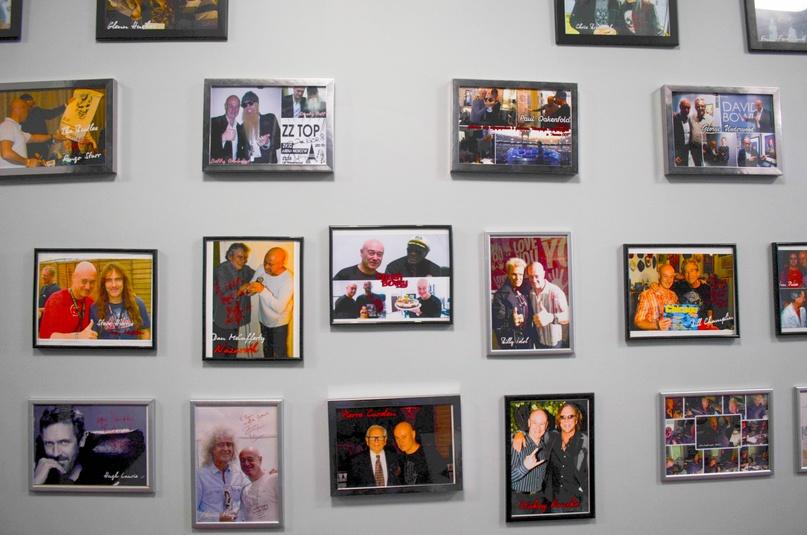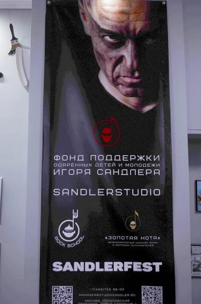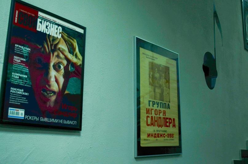 Поднимаемся на третий этаж бывшей типографии газеты «Московская правда» - все стены увешаны ретро-плакатами с молодым Сандлером, на которых - его бурная музыкальная молодость в группе «Индекс-398». Заходим в двери Продюсерского центра, и там все стены уже увешаны фотографиями нашего героя с друзьями: Брайаном Мэем, Deep Purple, Микки Рурком, Кори Тейлором и еще десятками (если не сотнями) российских и западных звезд мировой величины.