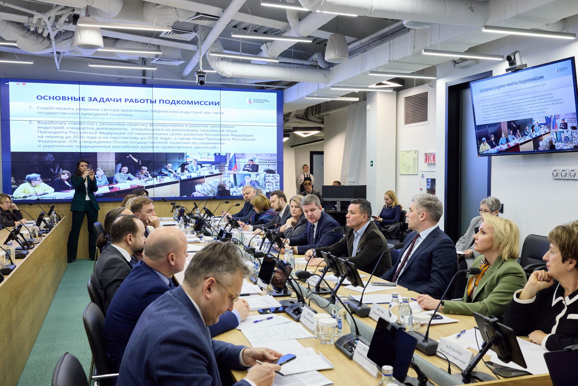 Особое внимание на заседании было уделено роли креативного сектора в формировании традиционных духовно-нравственных ценностей. Роман Карманов, возглавляющий профильную подкомиссию, напомнил, что предложено выработать определение ценностно ориентированных креативных индустрий. Такая работа уже проводится экспертами во главе с Андреем Полосиным. «Мы совместно работаем над описанием критериев ценностно ориентированных креативных индустрий. Их после согласования предложим включить их в 330 Федеральный закон «О развитии креативных (творческих) индустрий в Российской Федерации», – отметил Роман Карманов. Членами подкомиссии также подготовлены предложения по созданию и внедрению специального курса, посвященного культурному производству, в основе которого заложены традиционные российские ценности. Предложение одобрено Министром науки и высшего образования России Валерием Фальковым.