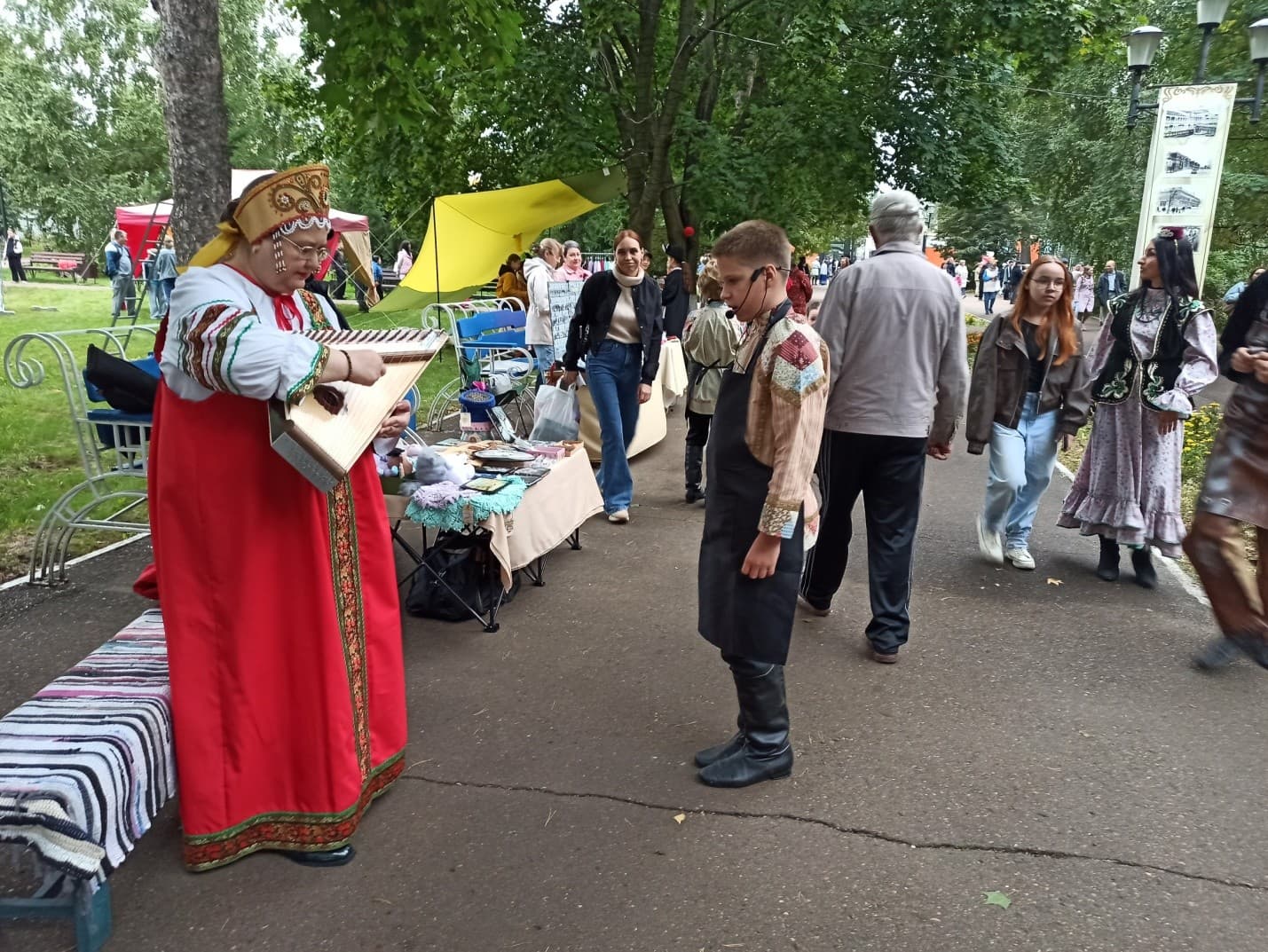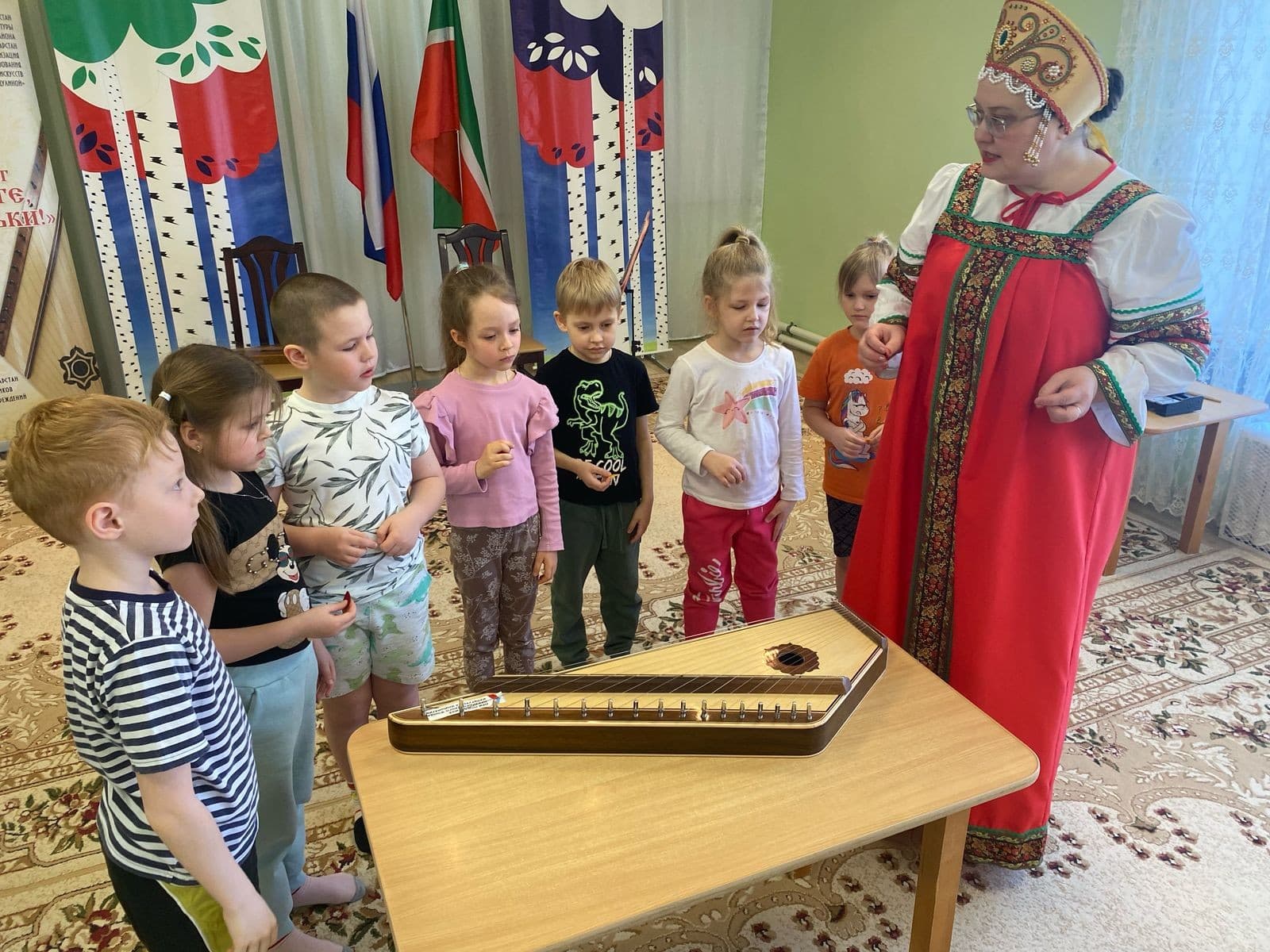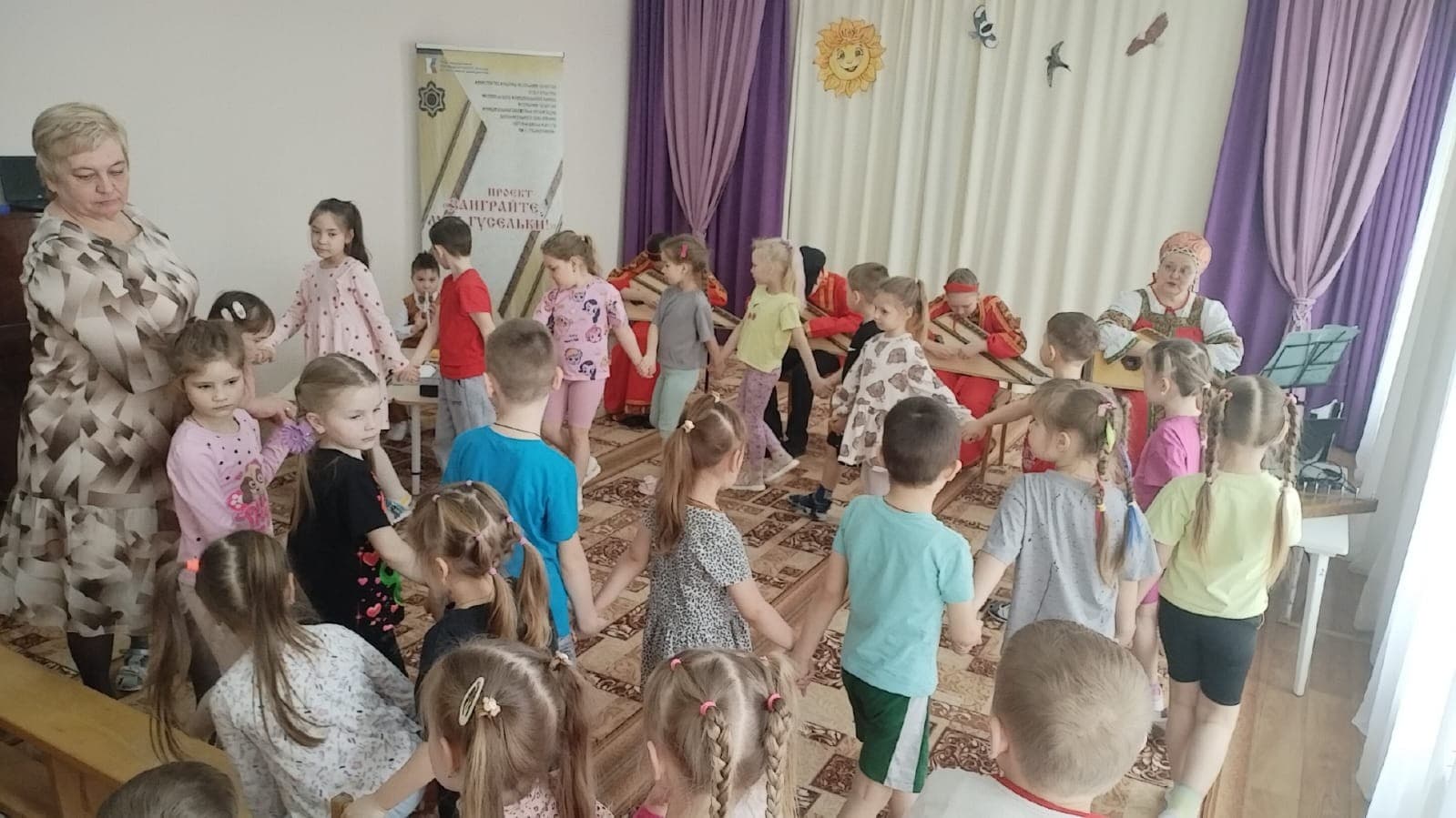 Формат встреч позволял не только услышать музыку, но и стать участниками события. На мероприятиях звучали народные и авторские мелодии, песни военных лет, произведения народов мира и классическая музыка. Гусли выступали как сольный инструмент, а также сопровождали вокал и другие инструменты. Дети активно включались в происходящее: подпевали знакомые песни, водили хороводы и пробовали играть на простых инструментах ансамбля — курае, ксилофоне и колокольчиках.